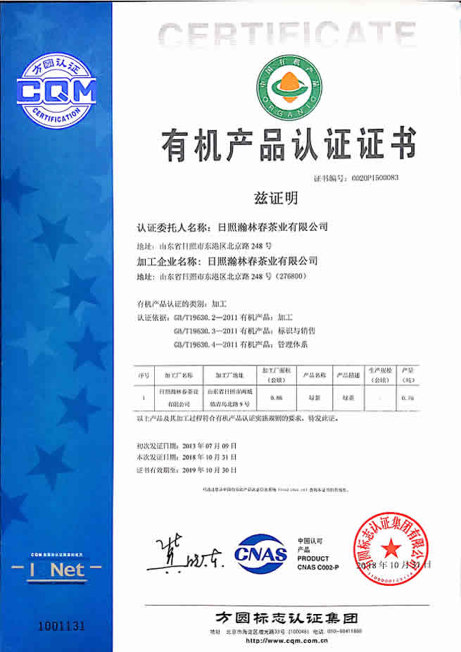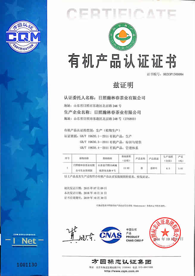 瀚林春茶业从2013年至今每年都获得国家颁发的”有机产品认证证书“,证书编号:0020P1500083