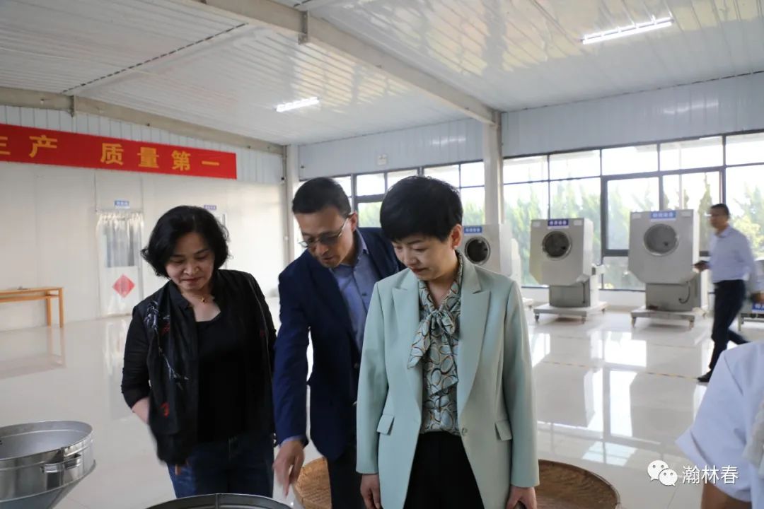在有机茶生产加工车间里,考察团一行参观了炒茶师傅炒制有机绿茶的过程。车间里弥漫着有机茶的浓郁香气,张金梅副市长和沙合鲁区长拿起刚炒制出来的有机绿茶闻香品尝。