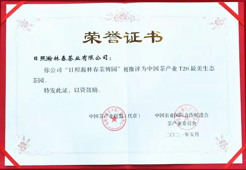 近日,中国茶产业联盟和中国农业国际合作促进会茶产业委员会联合举办的中国茶产业T20最美生态茶园、区域特色美丽茶乡、百条红色茶乡旅游精品路线推评活动圆满结束。经自愿申报、专家推评,确定日照瀚林春茶博园等36个茶园为最美生态茶园。
